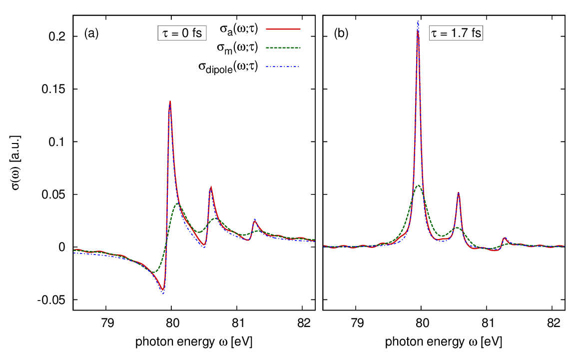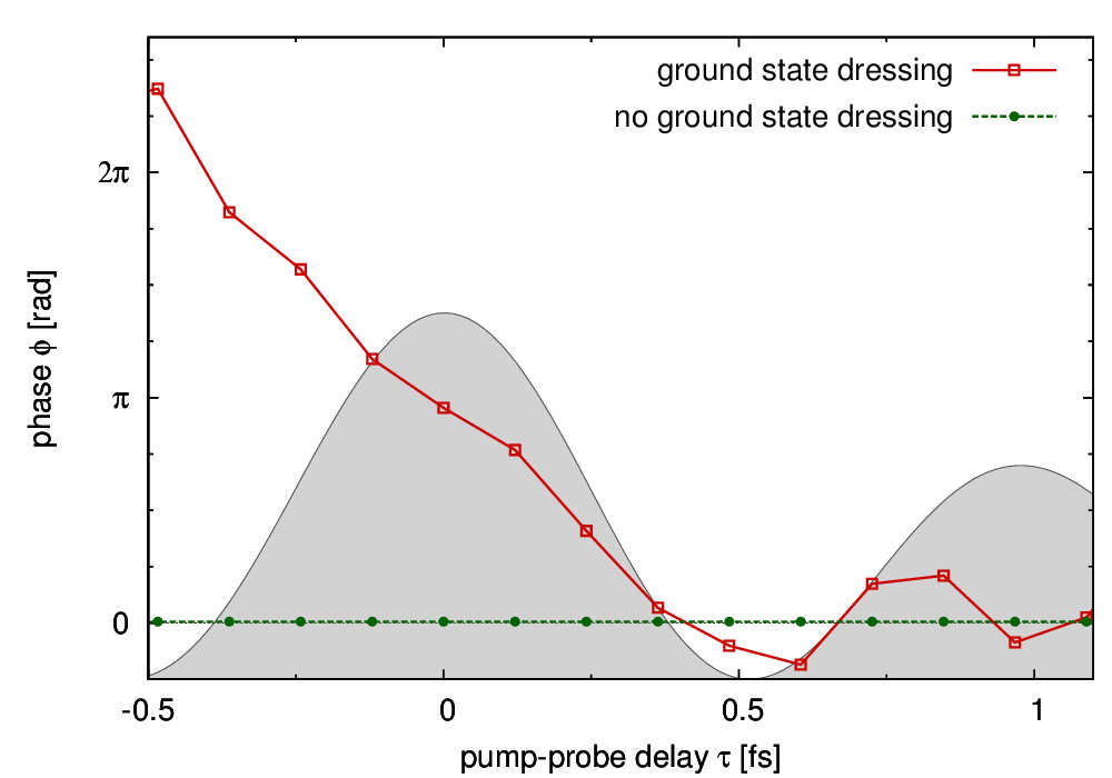 What is very interesting, the shapes of the absorption lines in Fig. 1 vary quite strongly for pump-probe delay between -1 fs and 1 fs. The height of the lines are related to the hole populations in the \(4p\) orbitals and the line shapes are related to the phases of each ionic states. Here, we are interested in the phase dynamics and what mechanism causes the phases to change so rapidly. The exact values of the phases can be extracted by fitting an oscillating dipole model to the data shown in Fig. 1. The red line in Fig. 3 shows the phase as a function of pump-probe delay for the \([4p_{3/2}^{m}]^{-1}\) ionic state (main transition line in Figs. 1 and 2). Within 2 fs the phase changes by more than \(2\pi\).